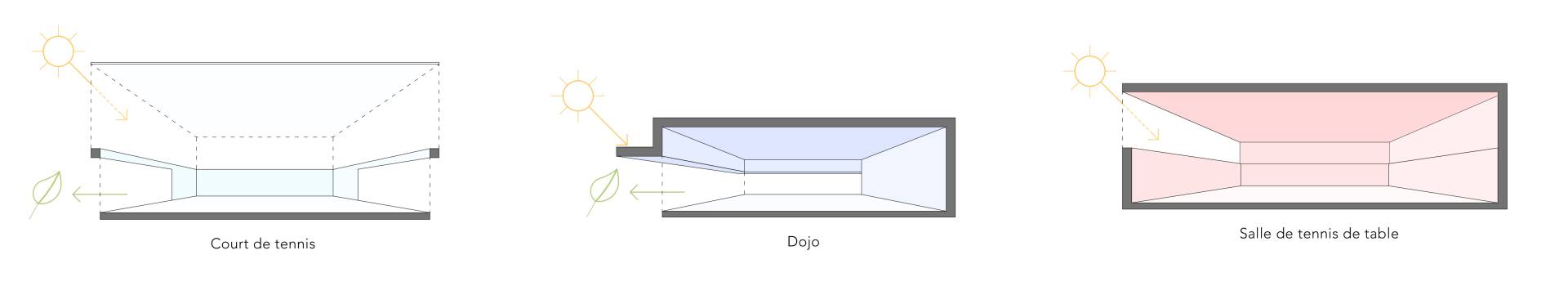 Le projet est pensé comme un bâtiment unique mais composé de trois entités : il s’adapte à l’échelle de son site en mettant en valeur chaque sport qu’il renferme dans un volume propre : tennis, judo et tennis de table. Les volumes sont connectés par une large toiture basse qui contient les espaces servants. Leur traitement de façade est fonction des usages : opaque, translucide ou transparent pour protéger, apporter une lumière tamisée, ou s’ouvrir sur le paysage au gré des besoins des sports et des orientations.