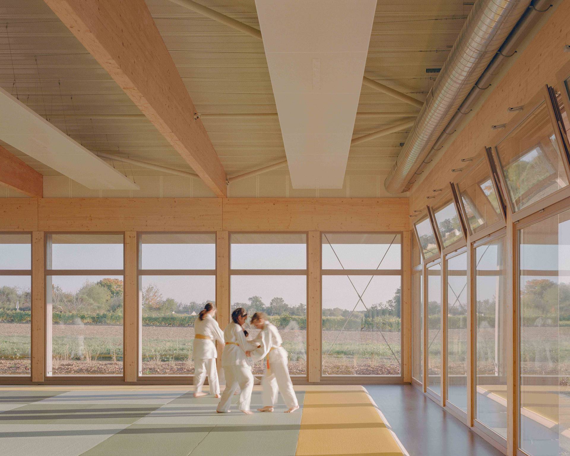 A l’image de la double échelle d’utilisation de ce nouveau complexe sportif, communale et régionale, le projet allie un statut d’équipement structurant placé en entrée de bourg, et la préservation d’un caractère terrien, dans un site agricole.