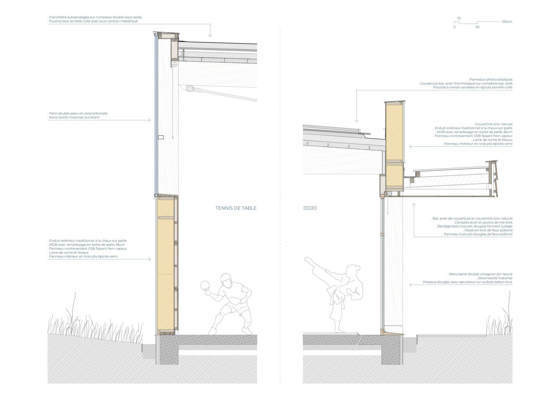 Le projet est pensé comme un bâtiment unique mais composé de trois entités : il s’adapte à l’échelle de son site en mettant en valeur chaque sport qu’il renferme dans un volume propre : tennis, judo et tennis de table. Les volumes sont connectés par une large toiture basse qui contient les espaces servants. Leur traitement de façade est fonction des usages : opaque, translucide ou transparent pour protéger, apporter une lumière tamisée, ou s’ouvrir sur le paysage au gré des besoins des sports et des orientations.