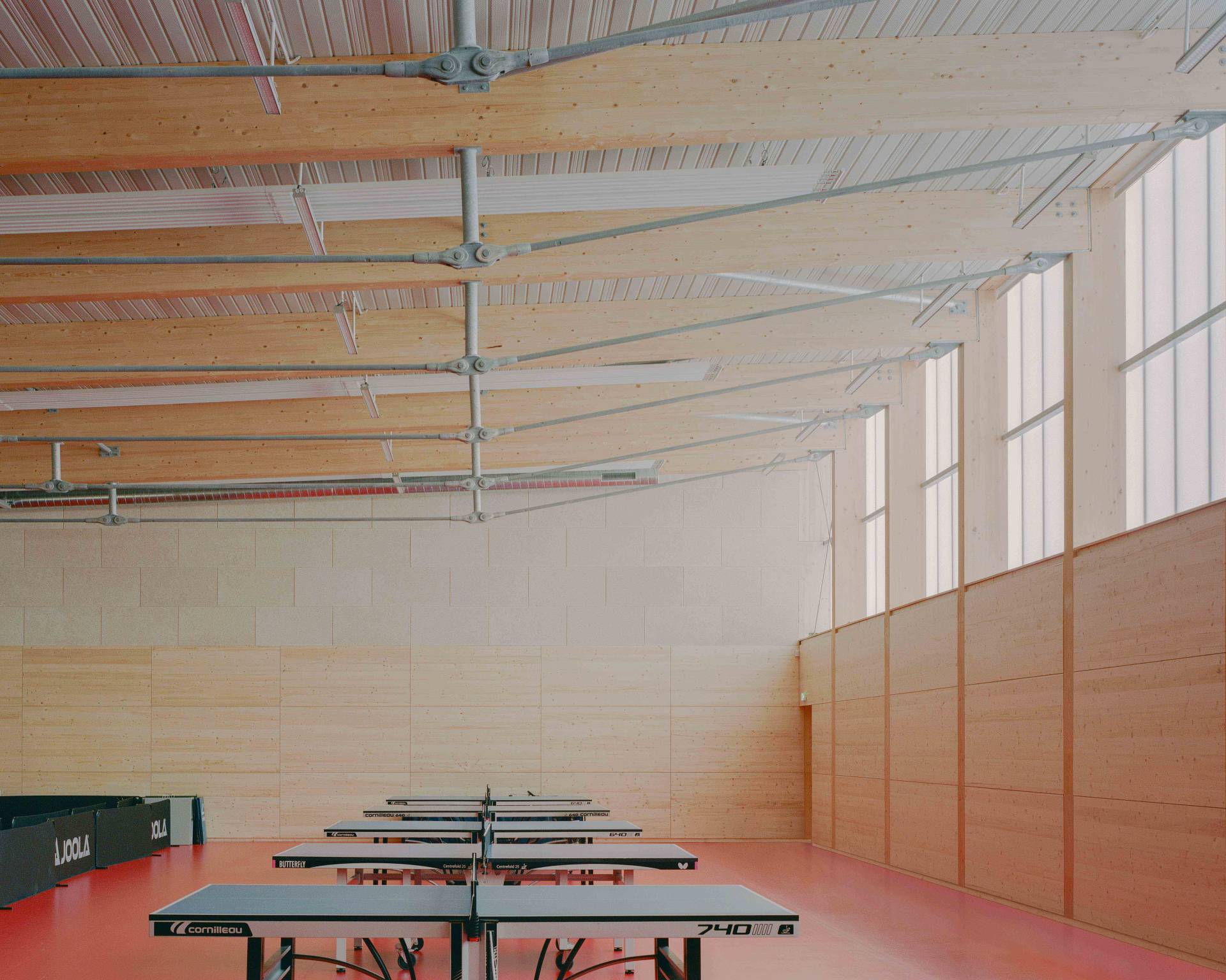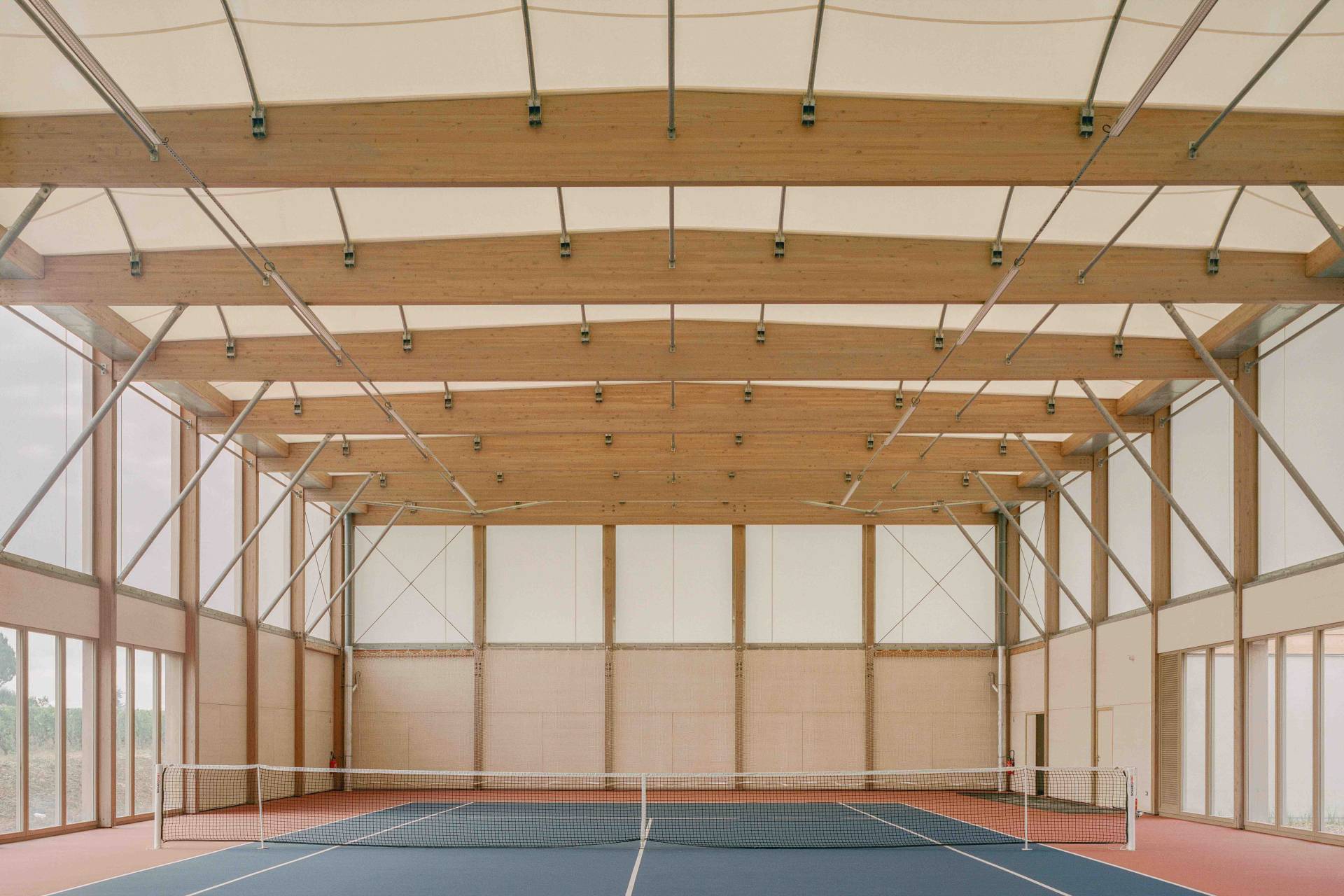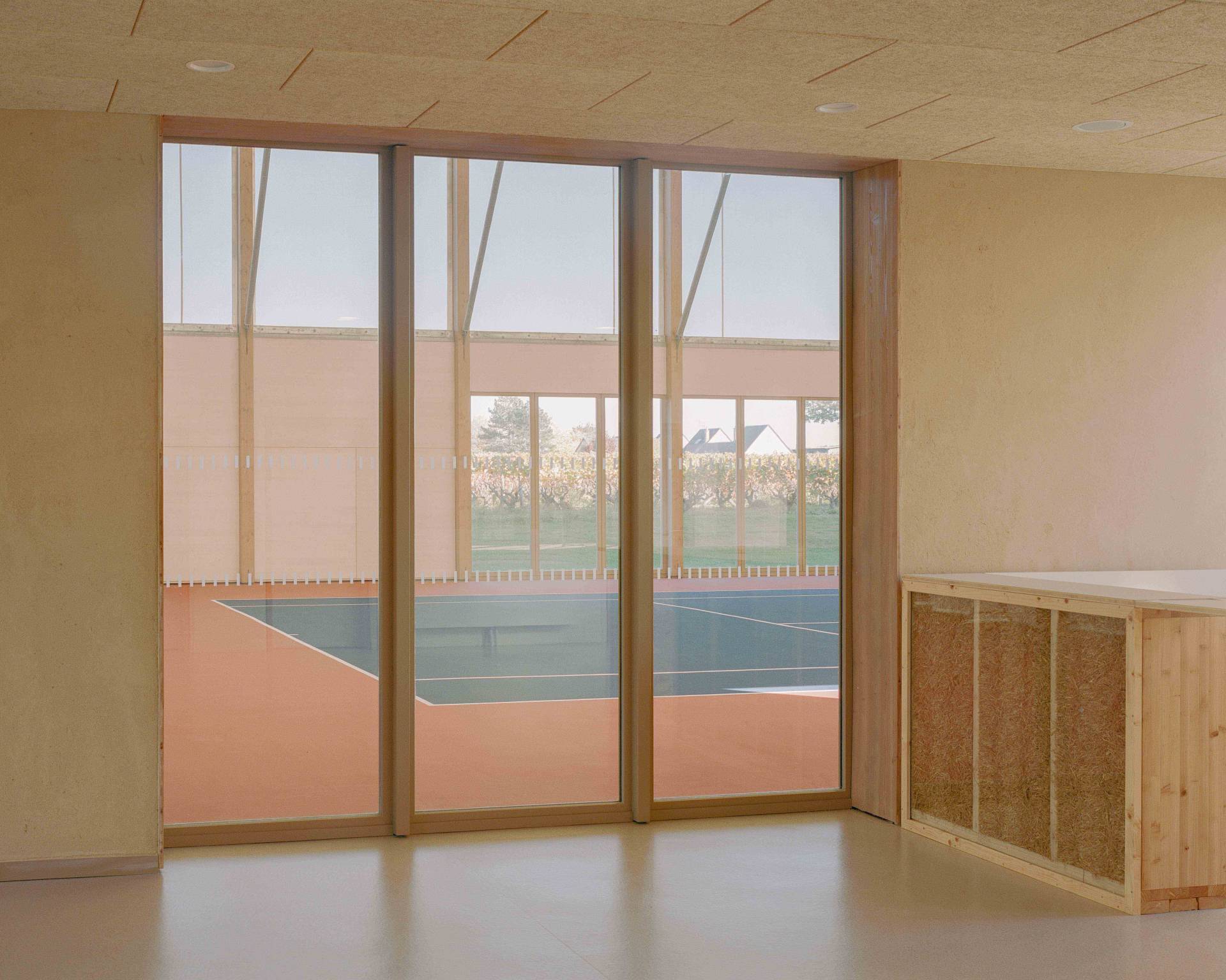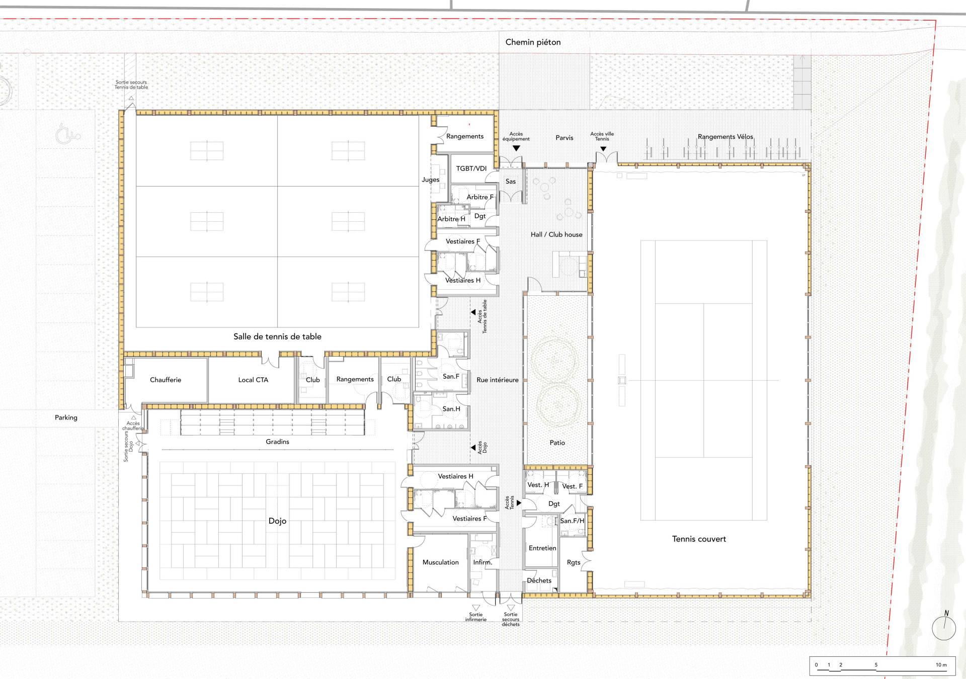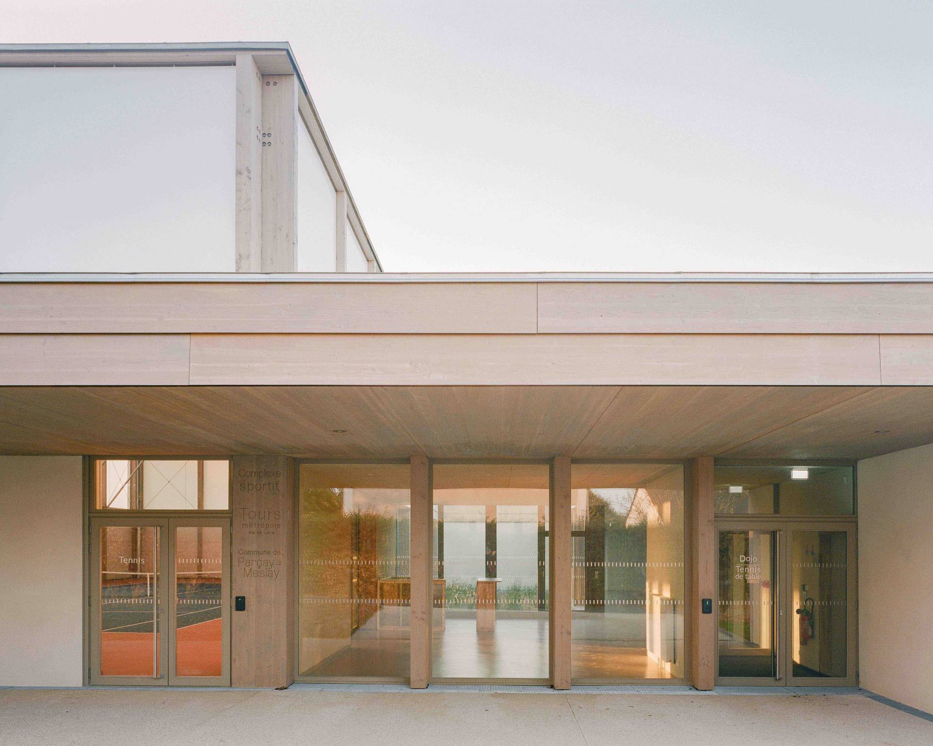 Le projet est pensé comme un bâtiment unique mais composé de trois entités : il s’adapte à l’échelle de son site en mettant en valeur chaque sport qu’il renferme dans un volume propre : tennis, judo et tennis de table. Les volumes sont connectés par une large toiture basse qui contient les espaces servants. Leur traitement de façade est fonction des usages : opaque, translucide ou transparent pour protéger, apporter une lumière tamisée, ou s’ouvrir sur le paysage au gré des besoins des sports et des orientations.