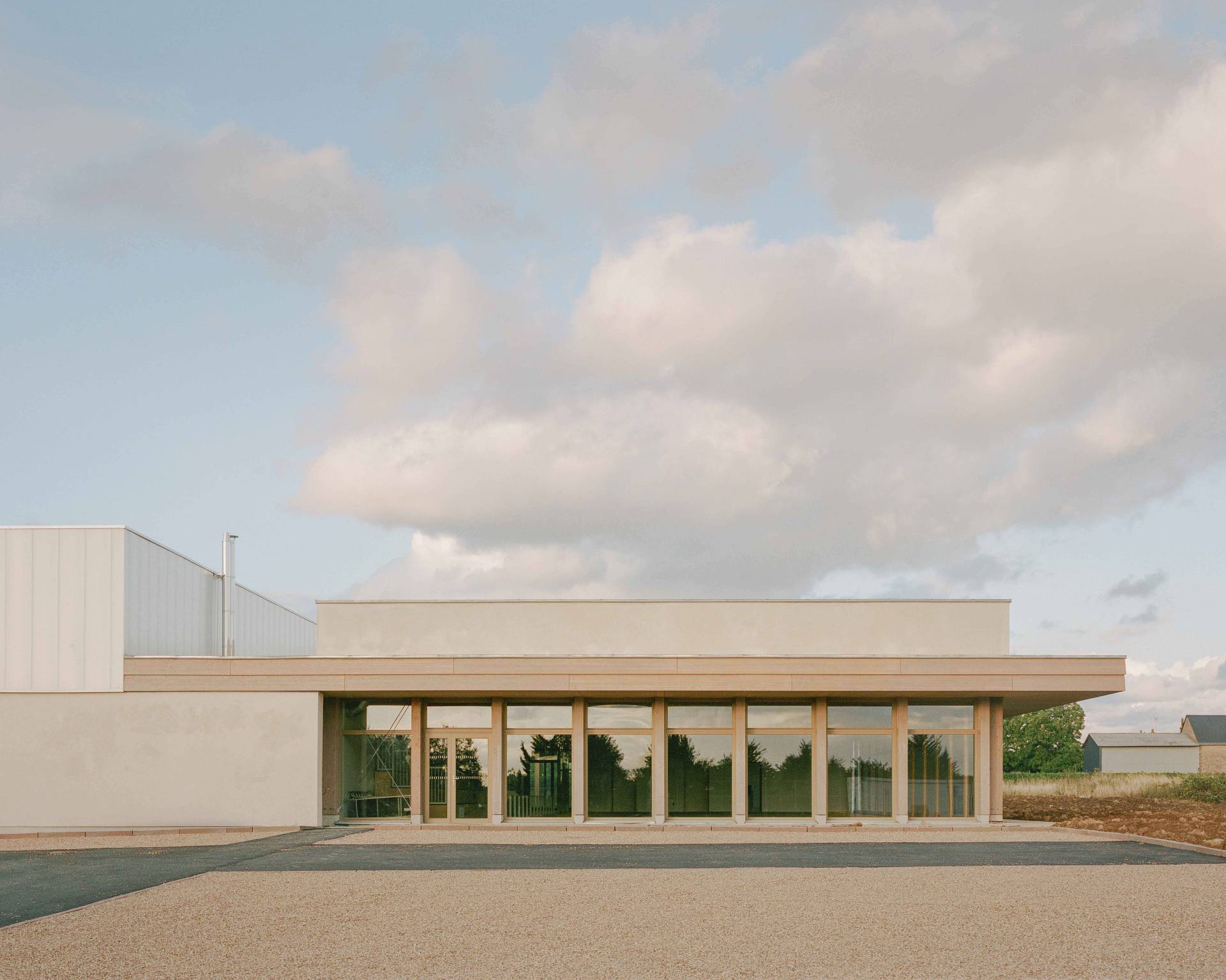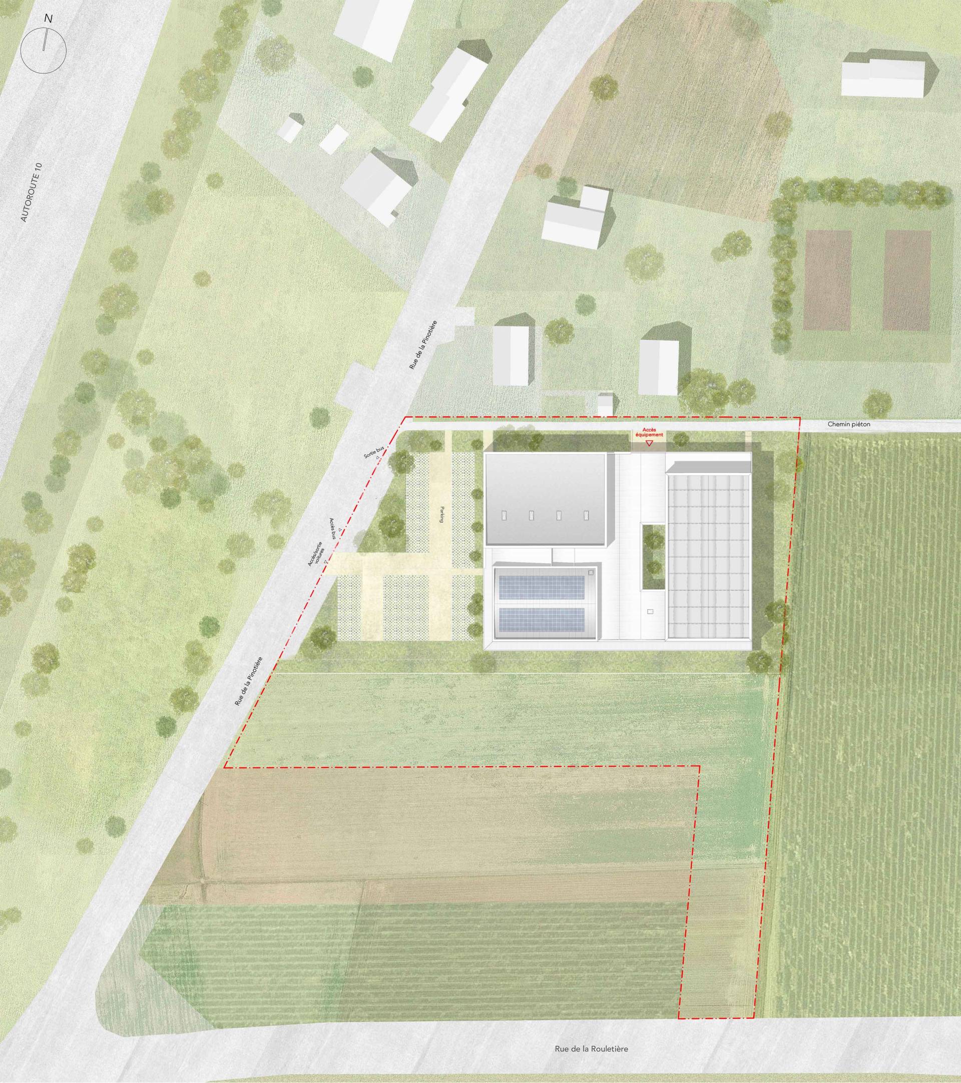 A l’image de la double échelle d’utilisation de ce nouveau complexe sportif, communale et régionale, le projet allie un statut d’équipement structurant placé en entrée de bourg, et la préservation d’un caractère terrien, dans un site agricole.